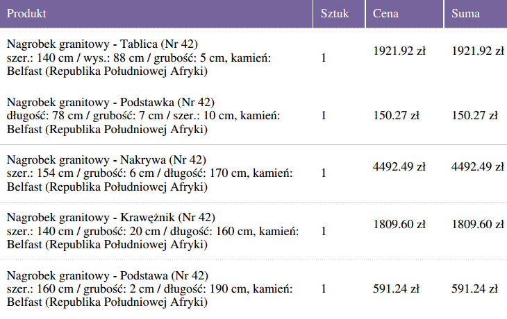 Podane ceny zawierają podatek VAT, koszt dostawy oraz instalacji nagrobka. Należy jednak zwrócić uwagę, żę podane ceny są cenami „orientacyjnymi” i mogą różnić się w poszczególnych regionach Polski, tym samym nie stanowią oferty handlowej w rozumieniu Art.66 par.1 Kodeksu Cywilnego.